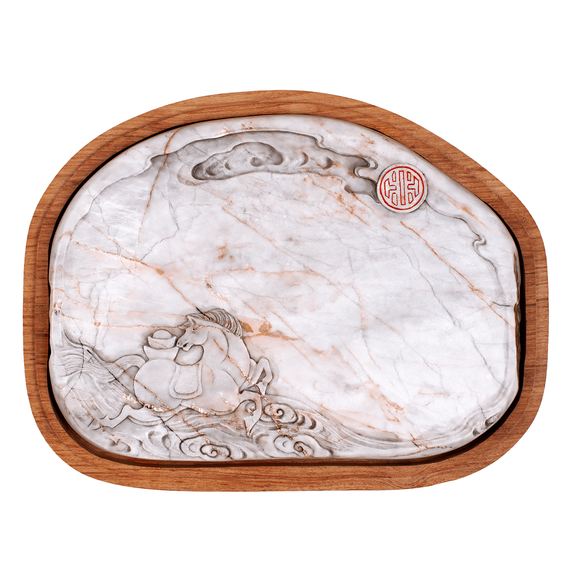 • DescriptionA sacred masterpiece revived from the legacy of Emperor Kangxi and Emperor Qian Long, this luminous white inkstone embodies purity, clarity, and celestial alignment. Carved from rare Imperial White Stone and activated through Grand Master David Goh’s hand-inscribed Big Dipper Talisman, it channels the blessings of benefactors, prestige, and divine authority. Natural black gold and cinnabar veins carry Heaven’s calligraphy across its surface, while auspicious motifs such as the Imperial Horse, Auspicious Clouds, and Cauldron convey triumph, smooth ascension, and dynastic power. A living altar of wisdom and manifestation, the Bountiful Harvest Edition empowers its custodian to command prosperity, influence, and lasting legacy.